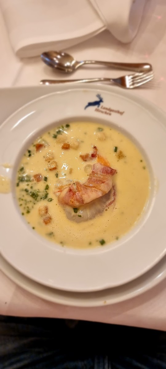 Landgasthof Hirschen is also known for its Selbstgebackenes Brot Mit Leckeren Dips (freshly baked bread with delicious dips), which adds a unique touch to the dining experience. The bread is soft and fragrant, while the accompanying dips provide a variety of tastes to explore, making it a perfect starter or snack. Another standout dish on the menu is the Schaumsüpple Vom Frühlingslauch Mit Scampi Im Speck, a spring leek foam soup served with succulent scampi wrapped in crispy bacon. The combination of light, fresh flavors with the richness of bacon and seafood makes it a truly unforgettable dish.